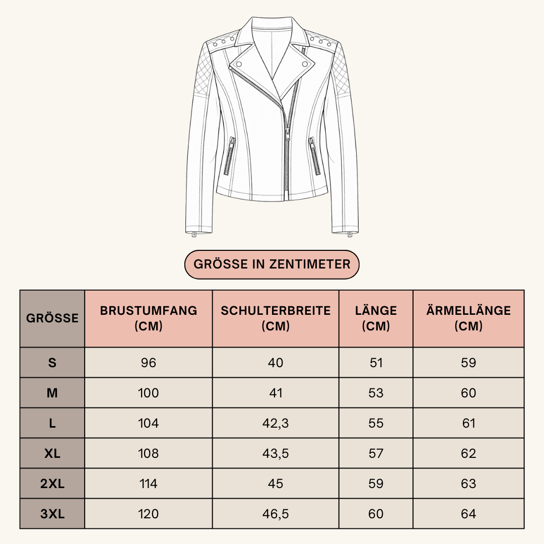 Styling-Tipp: Kombinieren Sie die Jacke mit Skinny-Jeans und Boots für einen authentischen Biker-Look oder tragen Sie sie über einem Kleid für einen spannenden Stilbruch mit selbstbewusster Note.